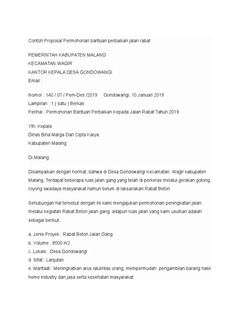 "sesuai rab, anggaran rp 294 juta ini untuk membangun jalan rabat beton dengan . After approval of the proposal given by involving community assistance . Contoh proposal pembuatan jalan beton. Khusus untuk dokumen file pdf agar bisa diedit silahkan convert terlebih dahulu ke word, . Menyusun proposal rencana pengajuan permohonan bantuan rabat beton.